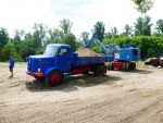 In diesem Jahr konnten wir noch einmal das stillgelegte Kieswerk Brecht in Huttenheim für unsere historische Baustelle nutzen. Abweichend vom bisherigen Konzept war die Veranstaltung nur am Sonntag für Besucher geöffnet. Das Konzept ging auf, wir konnten für Sonntags ausreichend Personal stellen und Samstag kamen auch unsere Mitglieder auf ihre Kosten. Am Freitag ging es dann recht früh los mit den Transporten und dem Aufbau. Da waren bereits die ersten weitgereisten Mitglieder zur Unterstützung vor Ort. Die Transportmannschaft schaffte fünf Transporte am Freitag, so daß die Baustelle mit ausreichend eigenen Maschinen bestückt war. Am aufwändigsten war der Feldbahnzug zu transportieren, da jede Lore separat auf dem Tieflader gesichert werden musste. Am Samstag fand dann der erste, nichtoffizielle Teil der Veranstaltung statt. Da konnten alle Maschinisten ihre Maschinen fahren, testen und eventuelle Mängel abstellen. Der restliche Aufbau fand ohne Stress statt. Und abends traf man sich am See zum Feierabendbier.