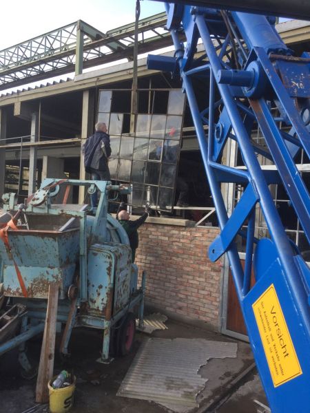 Zunächst konnten an der Ostfassade die letzten Tore montiert werden. Nun müssen die Füllungen eingebaut und die Zwischenräume zugemauert werden. Hier suchen wir noch einen Fachmann zur Unterstützung. Danach können die alten Rolltore demontiert werden.